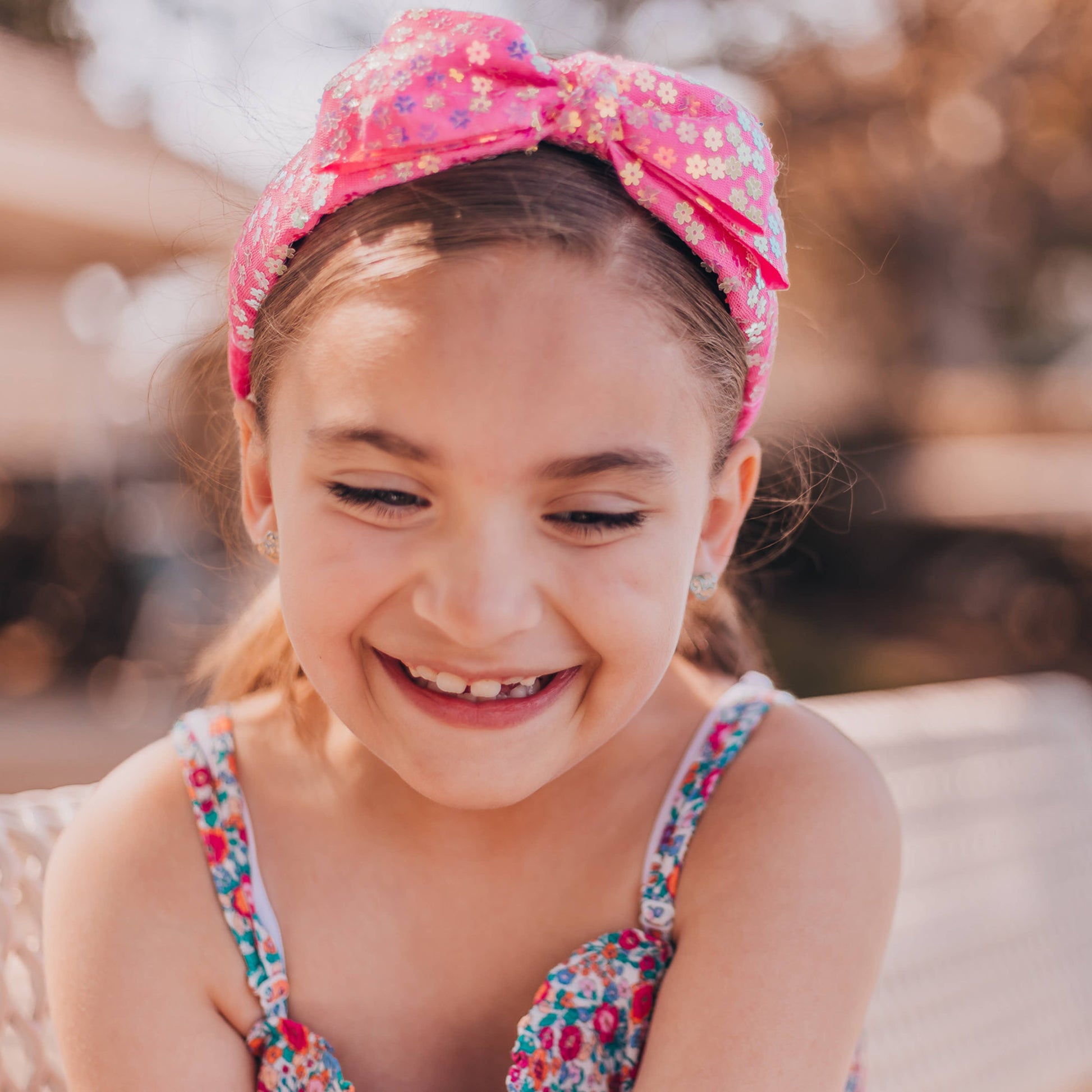 * Double layered big bow headband * Metallic daisy flower sequins * Colors - Hot Pink, Purple, Blue * 13 inch circumference to best fit toddlers to tweens