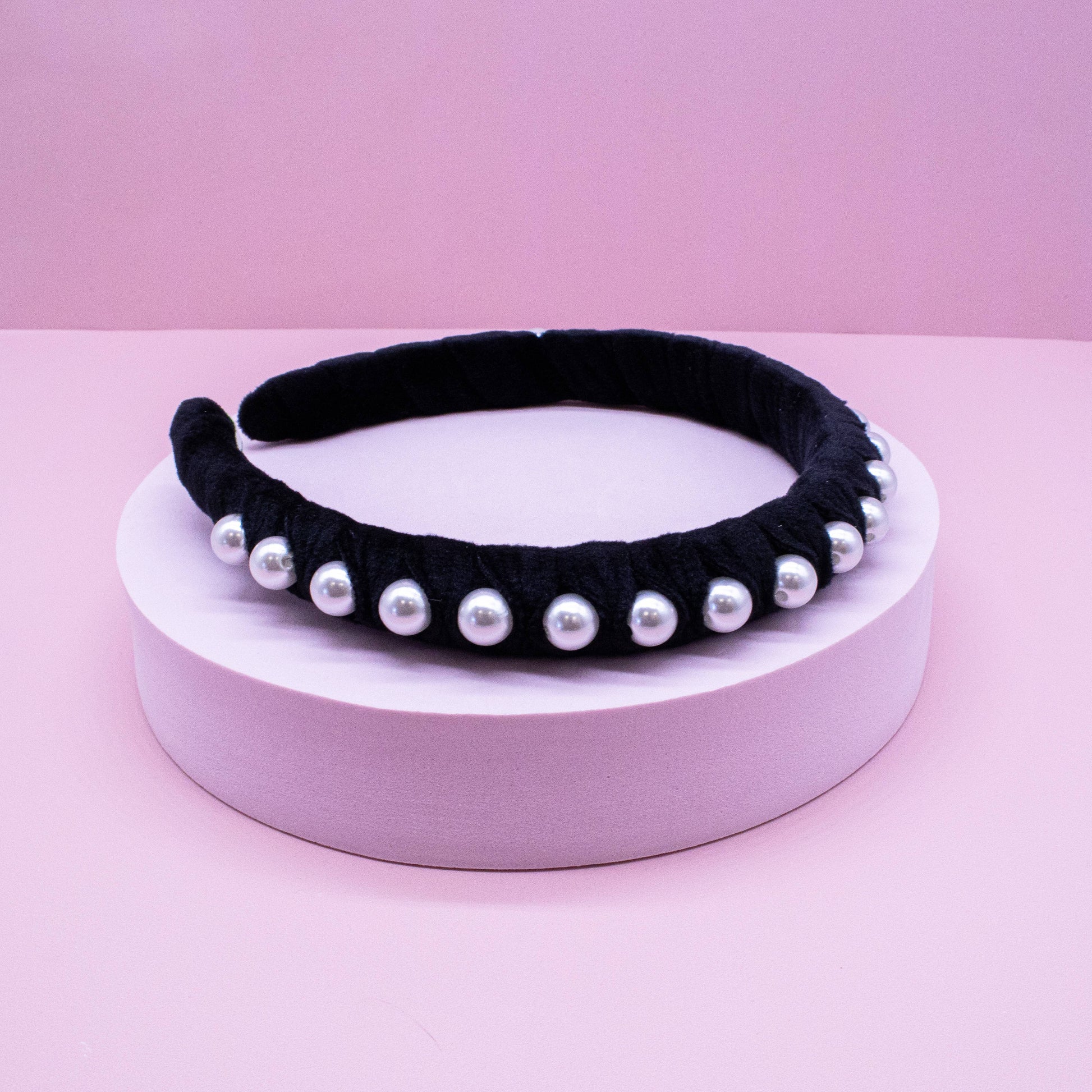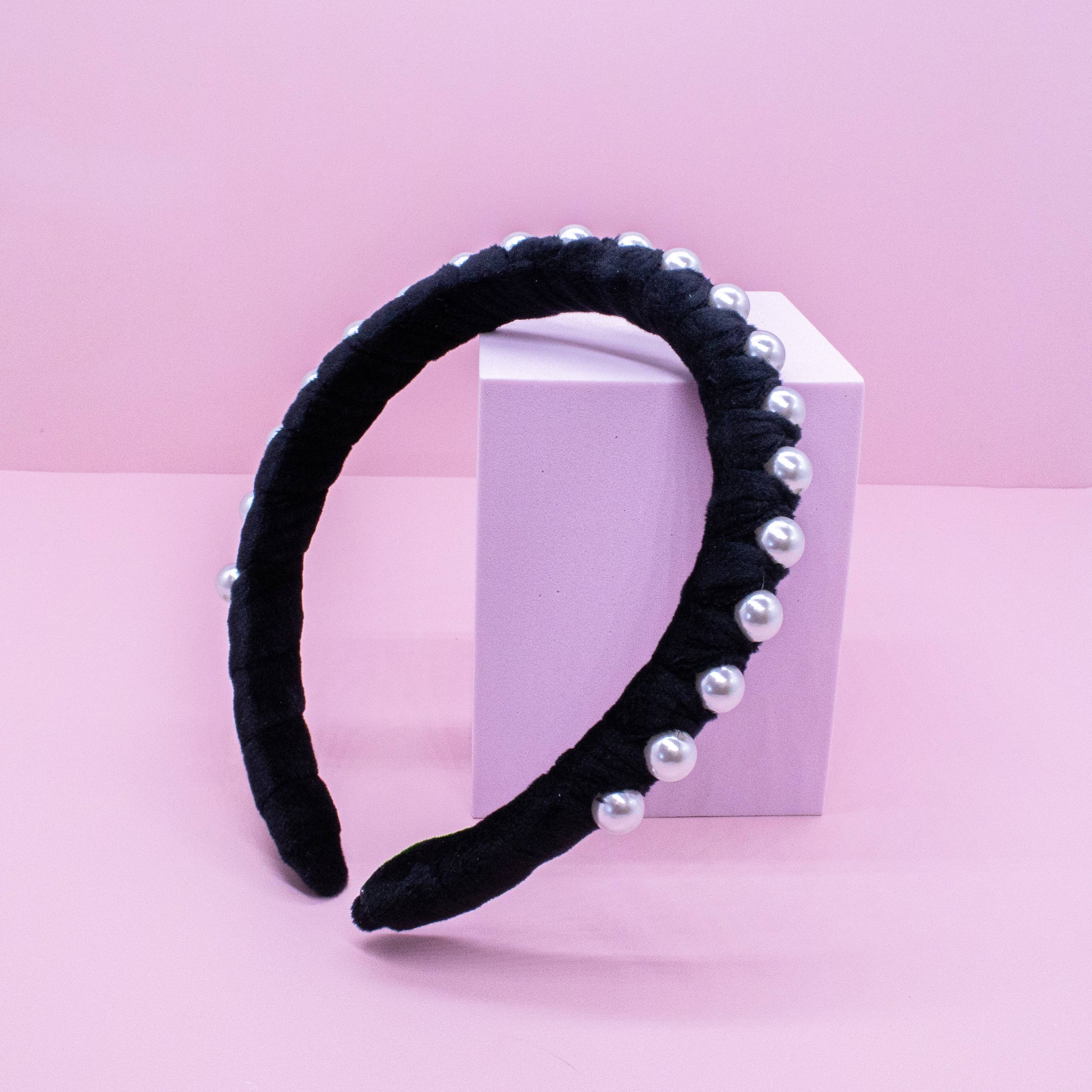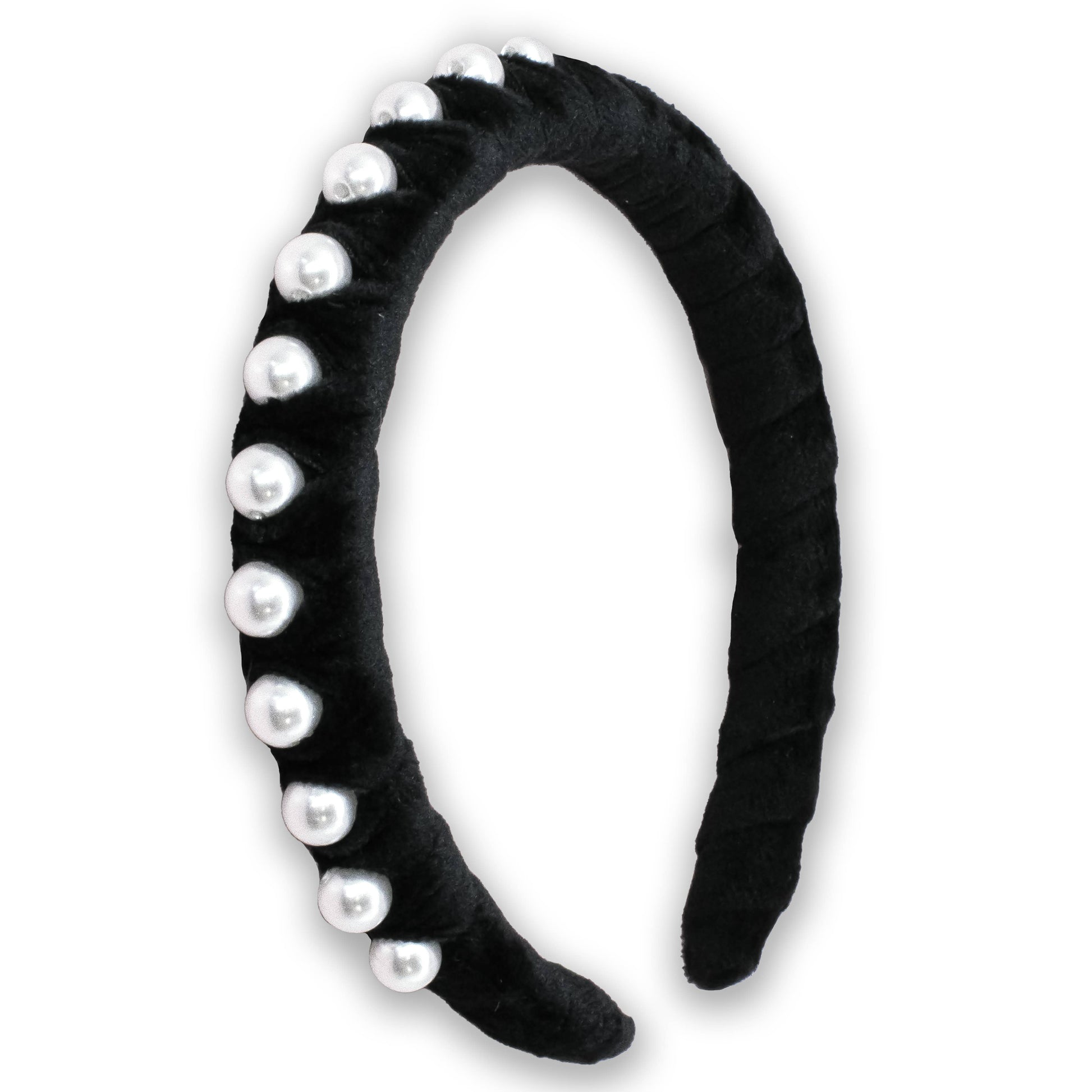 * Handwoven pearl headband * Soft black velvet material * Hard headband size 14 inch circumference fits best for kids to teens * Approximately 0.75 inches wide * Made with 10mm pearl beads * Comfortable for all-day wear