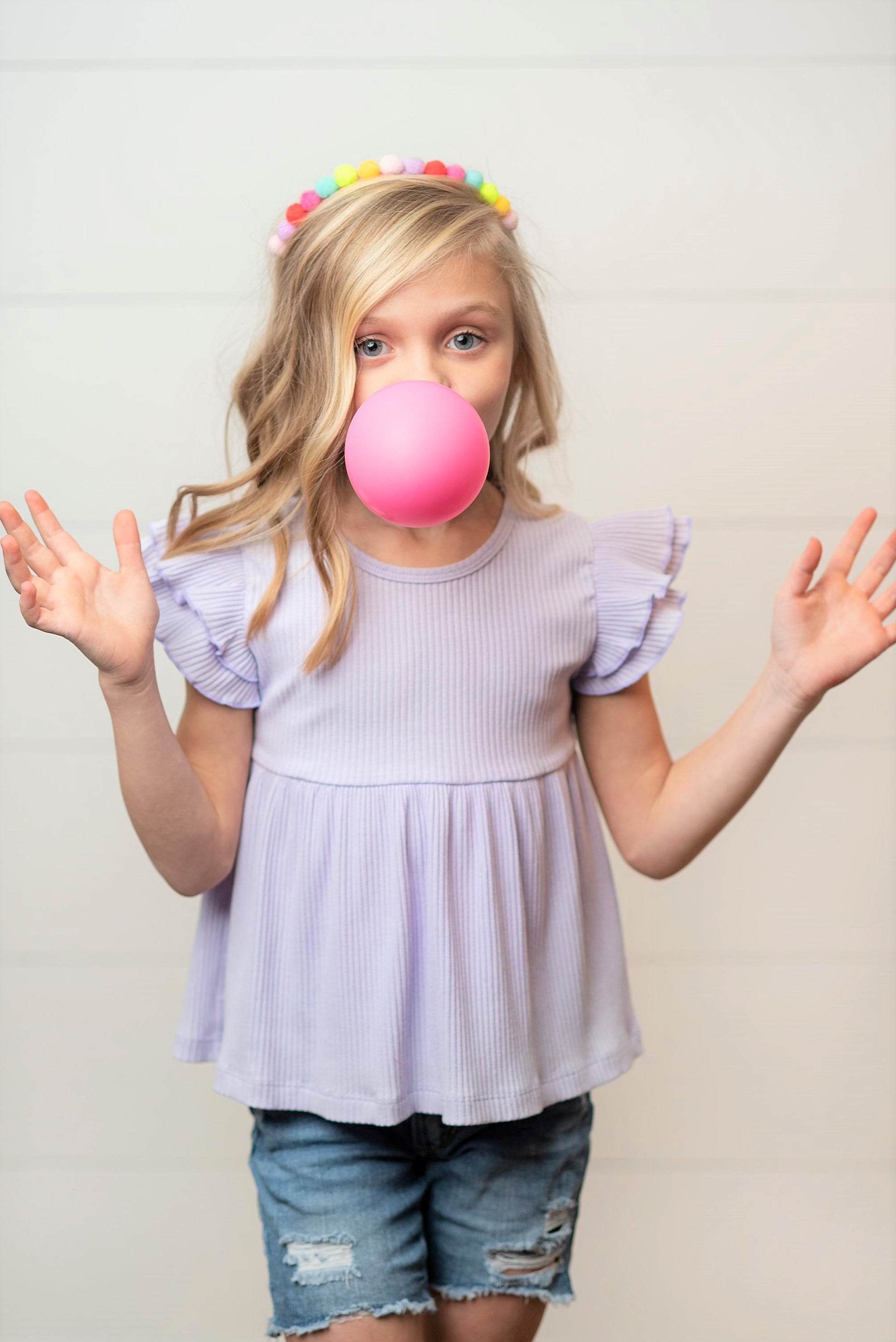 Girls lavender light purple double ruffle flutter short sleeve ribbed shirt is made of thick quality fabric. The perfect spring easter and summer staple!