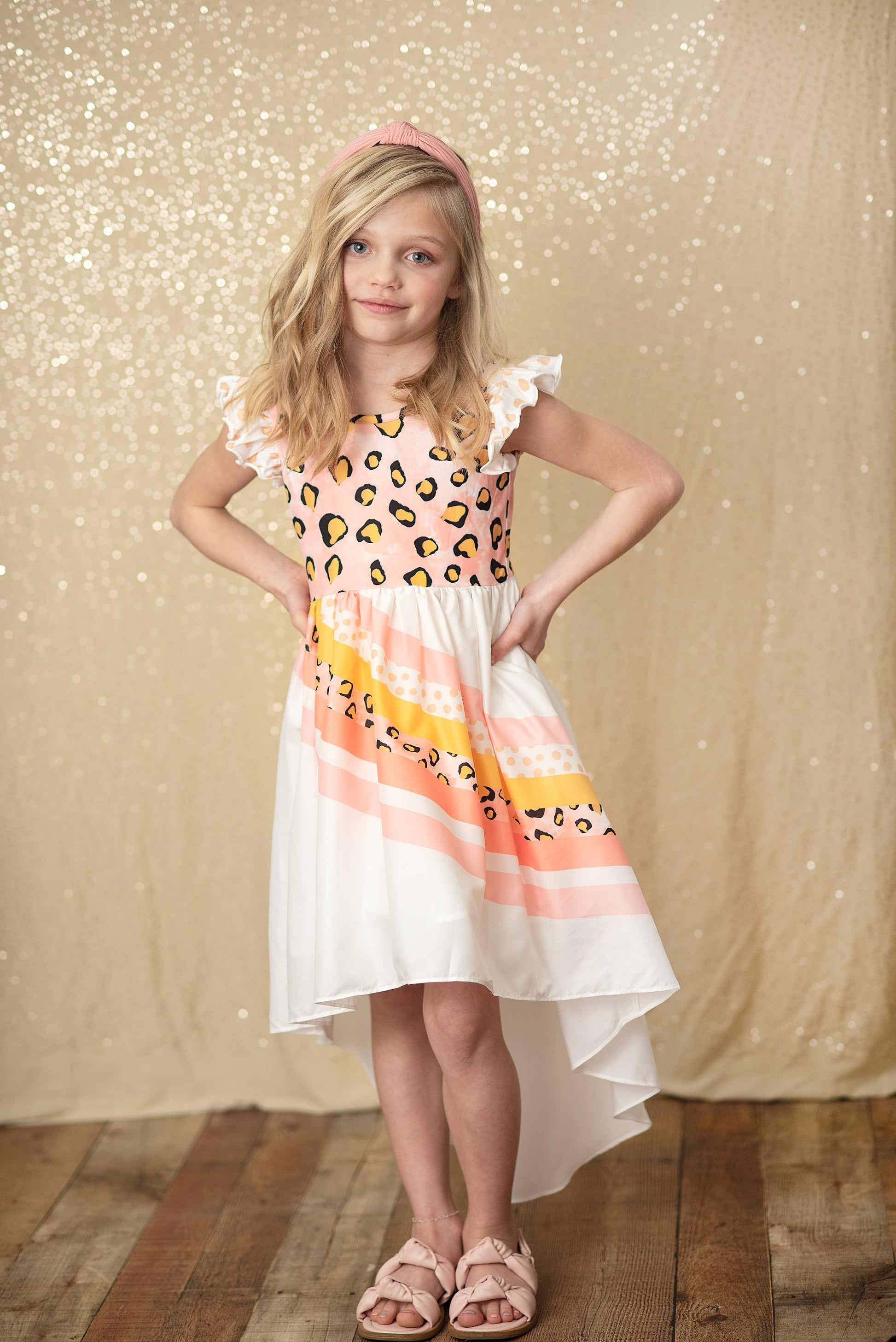 Girls leopard & pink short sleeve dress with color match rainbow detail. Perfect for Spring & Summer!
