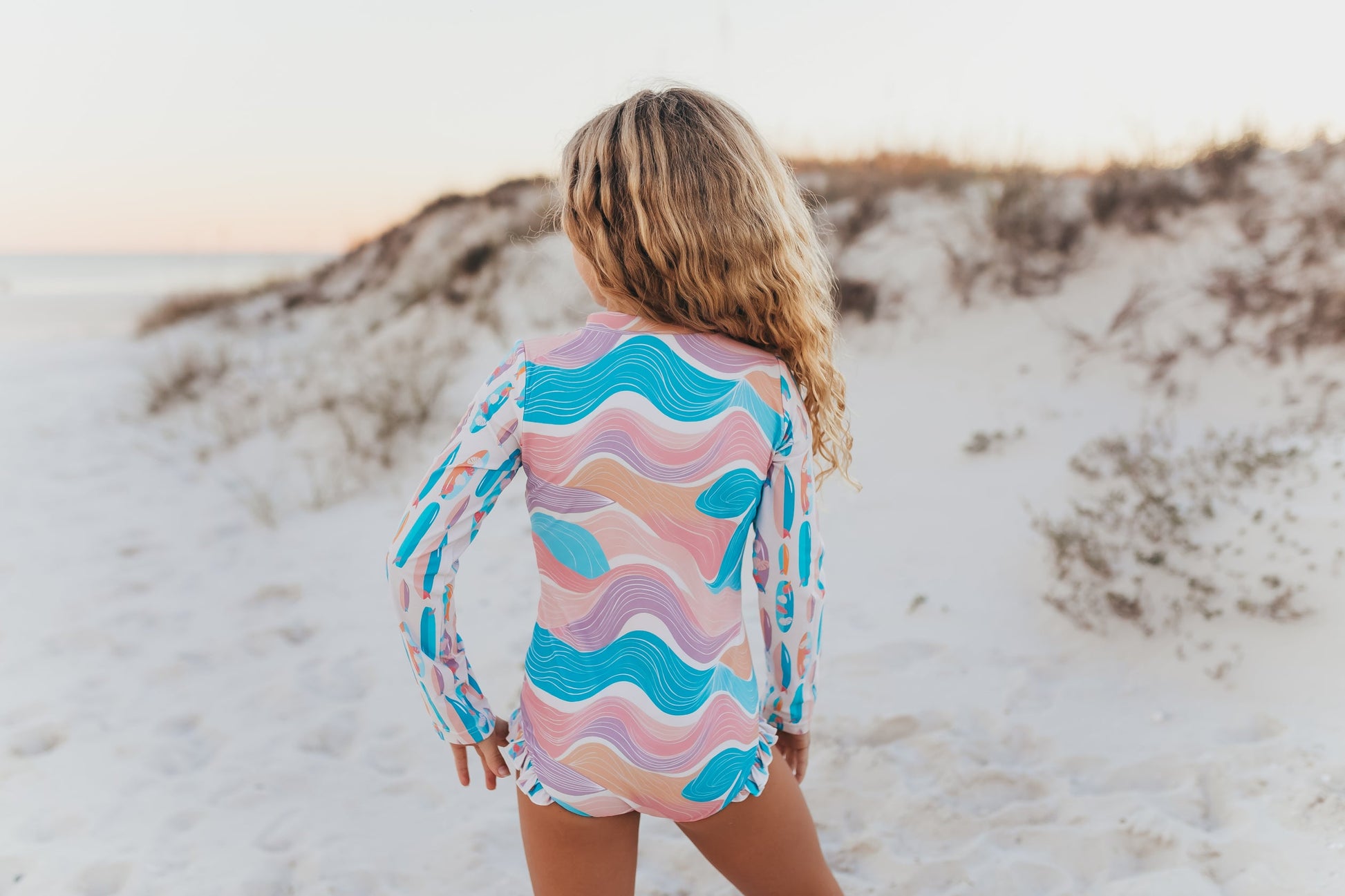 Girls pink, blue, purple rainbow wave surfboard print long sleeve one-piece zip up rash guard with ruffle detail.