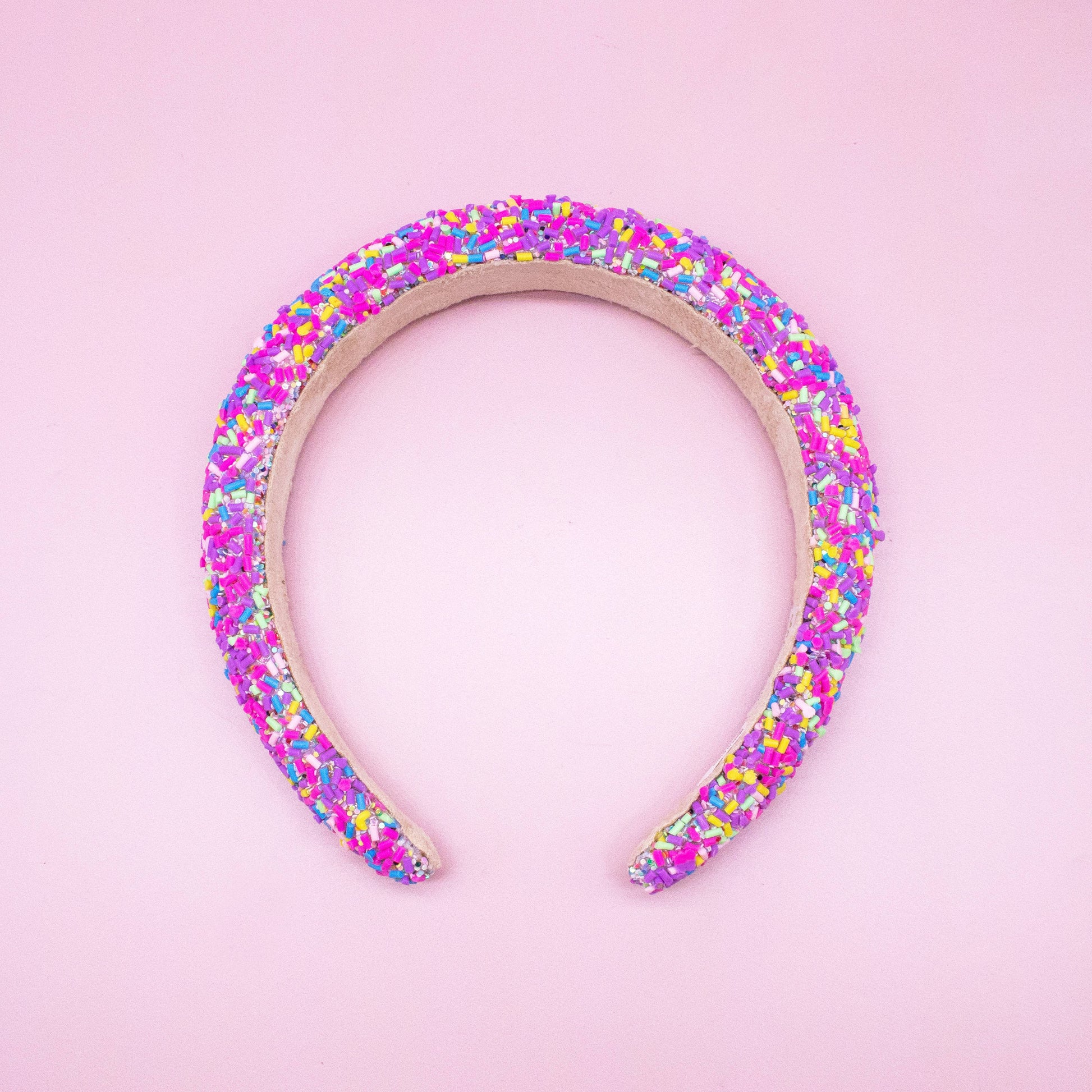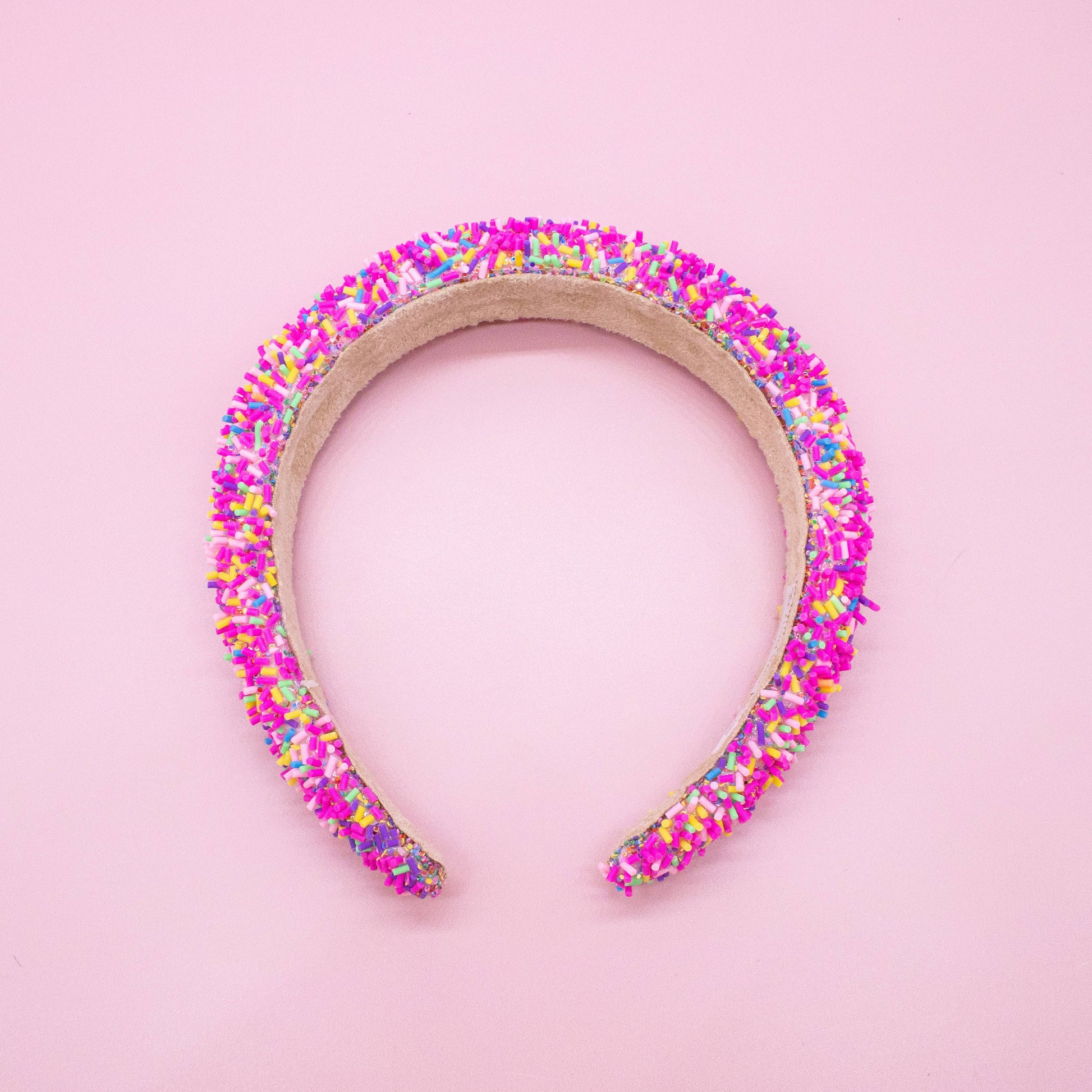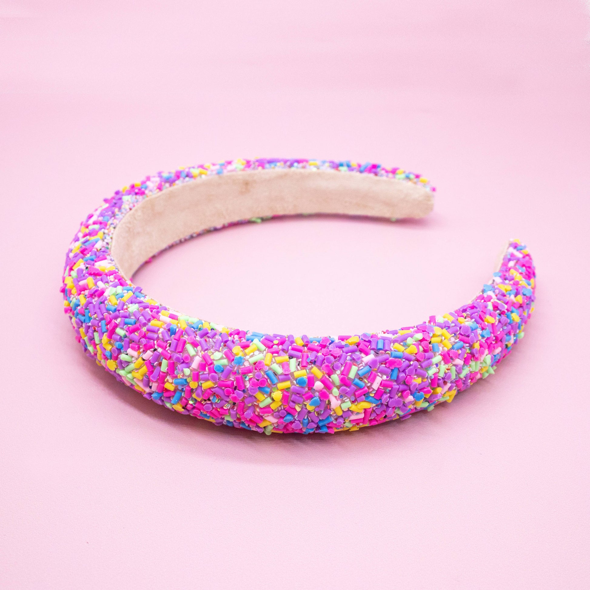 * Puffy tapered headband for girls * Embellished with rainbow confetti sprinkles * Colors - pink or blue * Flexible band with a comfortable inner lining * 13 inch circumference to best fit toddlers to tweens