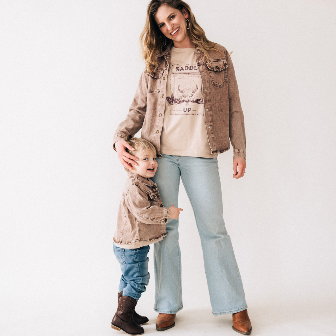 Matching tees for mama and her wild things! These western vibe shirts are adorable for matching either your son or daughter. Made with 95% cotton and 5% spandex for maximum comfort. The women's cut is a relaxed style making it flattering to all body types. Mom's shirt says, "Saddle Up" and the mini child shirt says, "In For A Wild Ride" featuring a longhorn skull and desert mountains.