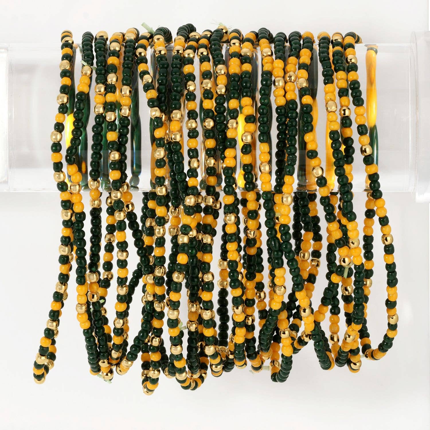 Get ready to rock your team colors with our vibrant Solid Seed Bead Game Day Bracelets! These spirited and stylish bracelets are the ultimate accessory for any dedicated fan, offering a subtle yet impactful way to showcase your team pride. Each bracelet features delicate seed beads meticulously strung together to create a lightweight and comfortable design. At the heart of each bracelet are high-quality 18K gold plated brass beads, adding a touch of luxurious gleam and ensuring durability.